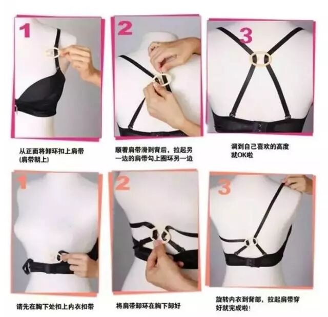 用肩带防滑扣把肩带在背后变成X型也是一个可靠的办法,也可以用一个大的牢靠的别针去把肩带别成X型。而且在夏天穿背心的时候,防滑扣可以把肩带隐藏住哦,还能聚拢胸型,提供更多支撑。